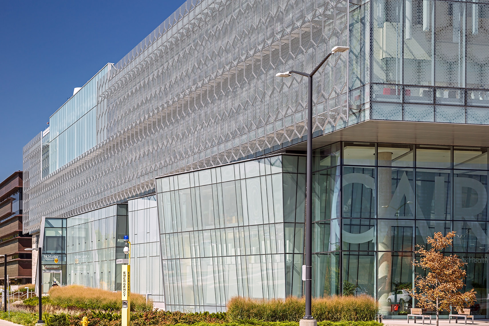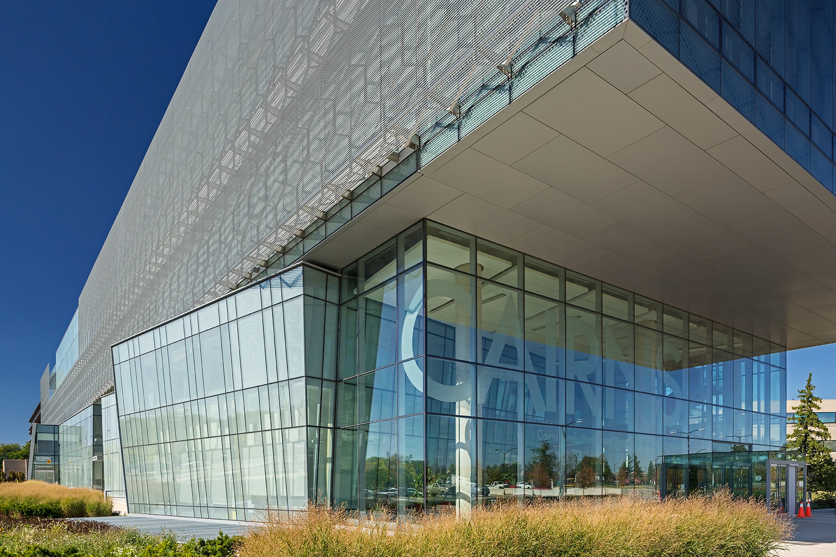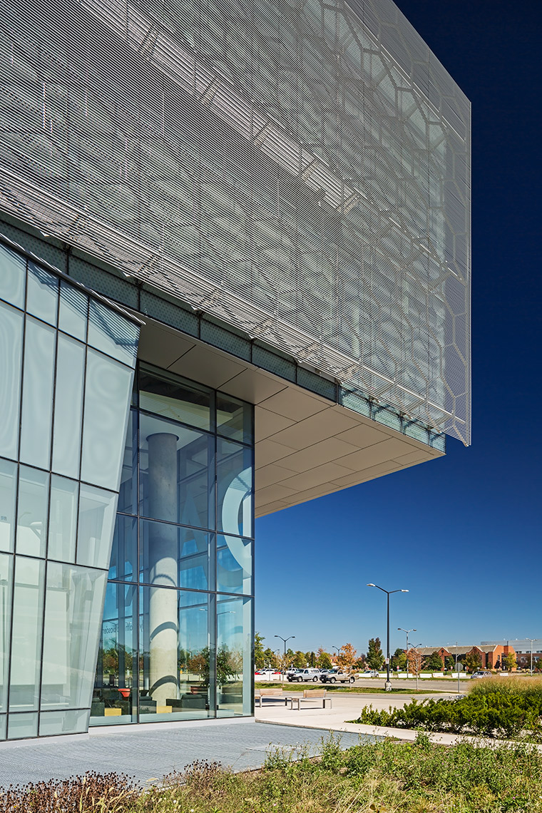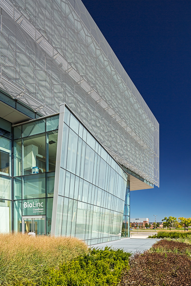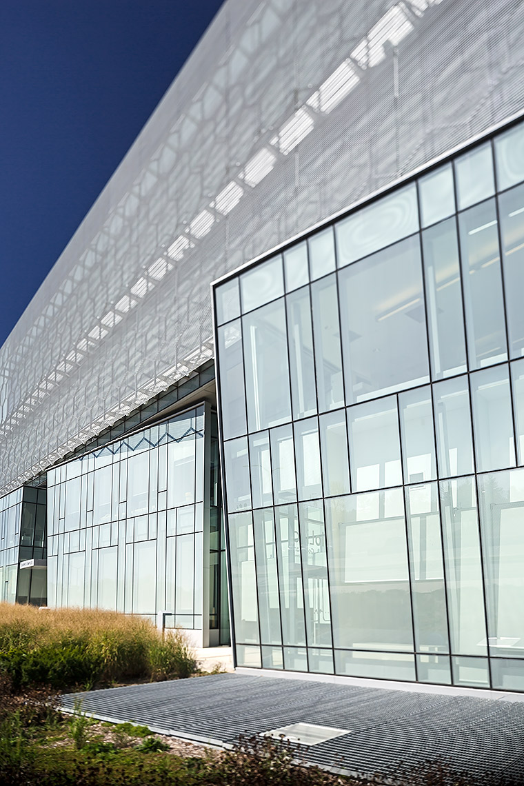 The CFHBRC is a 4-storey facility that opened in 2012 and introduced new laboratories, research facilities, and office space. The complex achieved LEED® Silver accreditation with green design features that included construction waste diversion, a building-wide recycling system, and locally-specified building materials chosen for low VOC, low embodied energy, and recyclability. Fritted and sandblasted glass curtain wall elements articulate the different faces of the building, while an aluminum ‘honeycomb’ screen that wraps the south and west facades further mitigates passive solar gain. Our team worked in a design assist capacity on this project, and provided a custom screen complete with catwalk, motorized parallel operating windows, and a custom silkscreen pattern optimized for design intent.