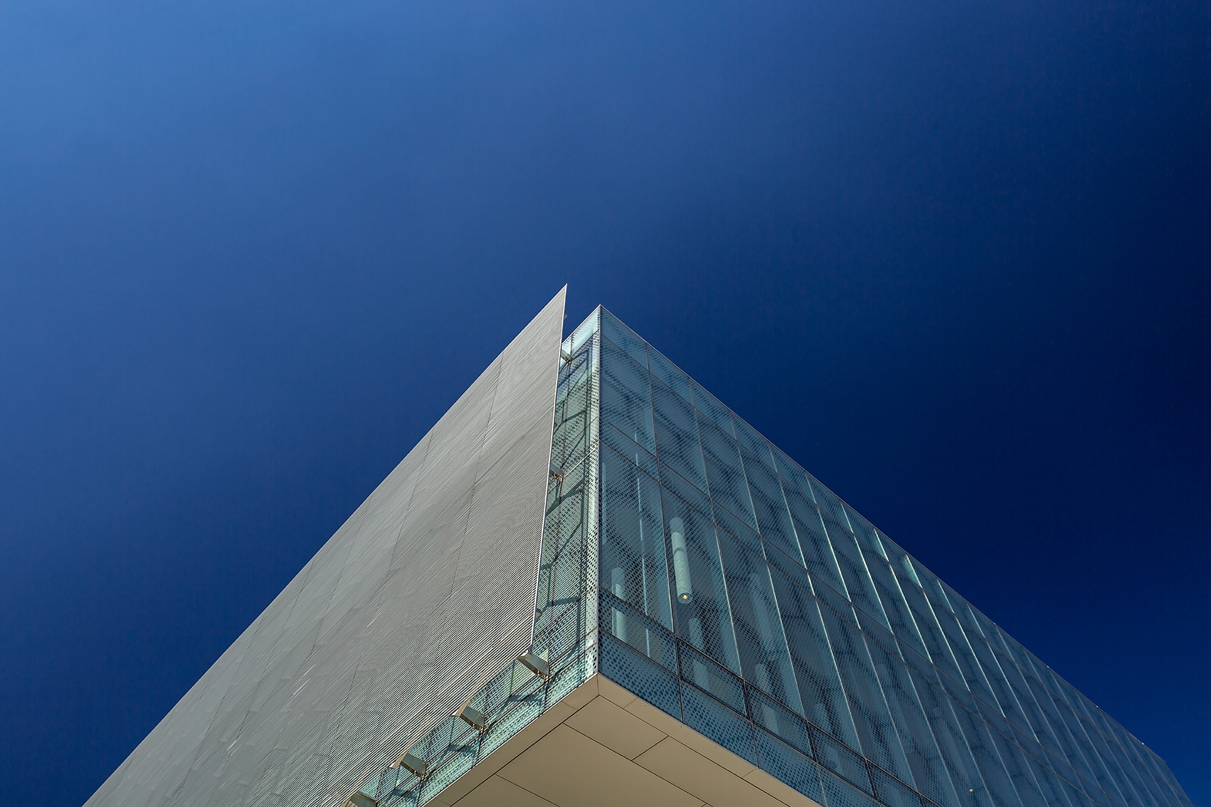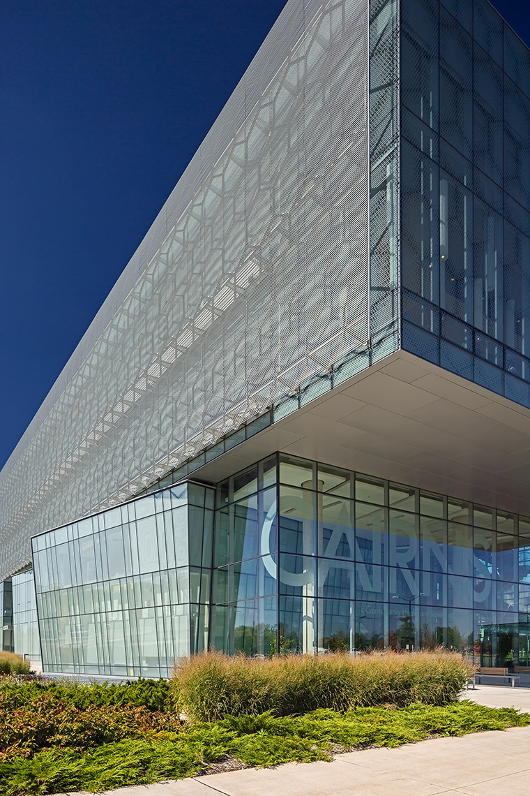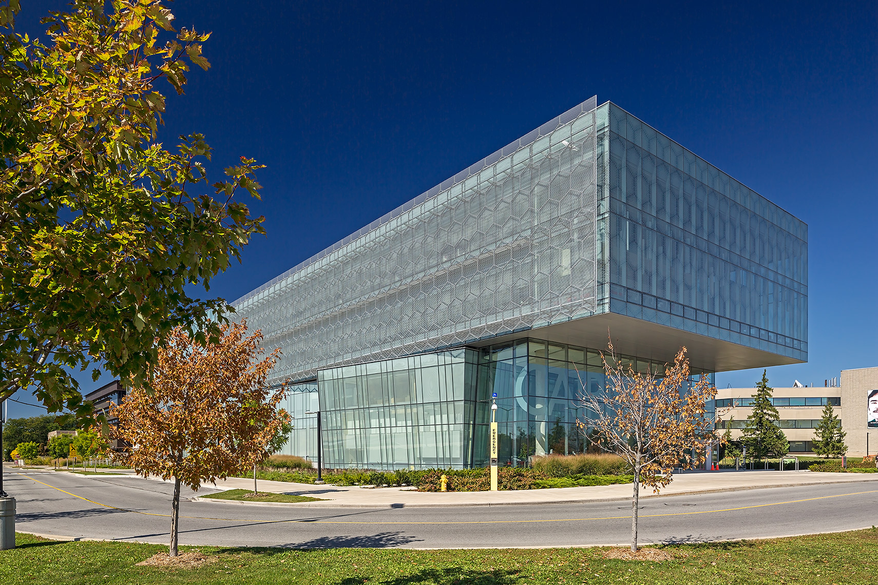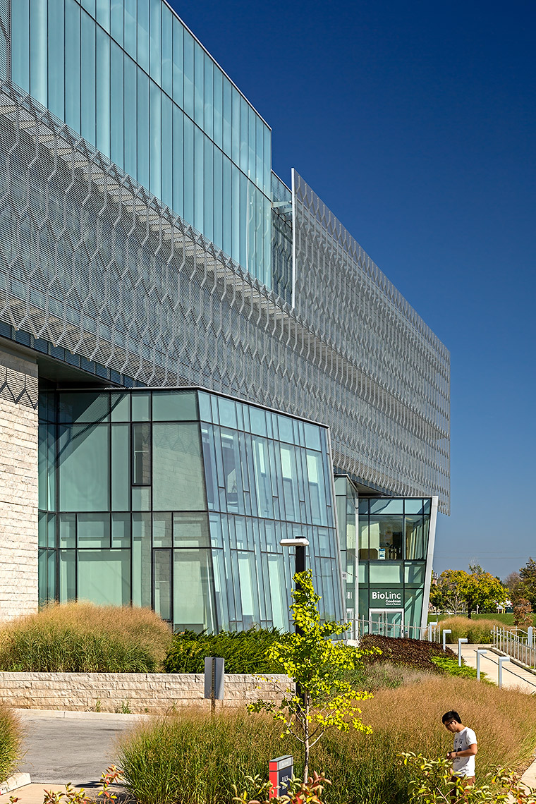The CFHBRC is a 4-storey facility that opened in 2012 and introduced new laboratories, research facilities, and office space. The complex achieved LEED® Silver accreditation with green design features that included construction waste diversion, a building-wide recycling system, and locally-specified building materials chosen for low VOC, low embodied energy, and recyclability. Fritted and sandblasted glass curtain wall elements articulate the different faces of the building, while an aluminum ‘honeycomb’ screen that wraps the south and west facades further mitigates passive solar gain. Our team worked in a design assist capacity on this project, and provided a custom screen complete with catwalk, motorized parallel operating windows, and a custom silkscreen pattern optimized for design intent.