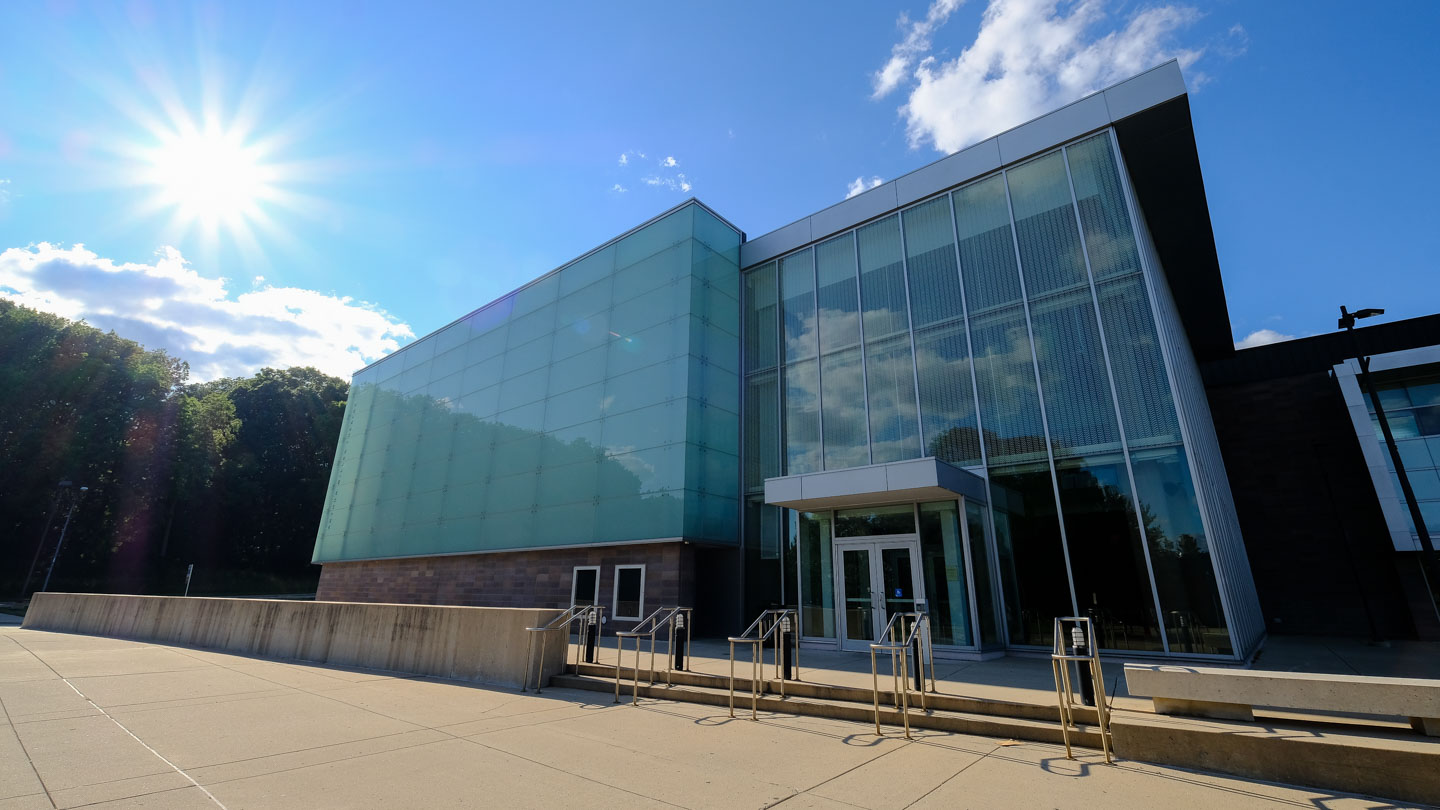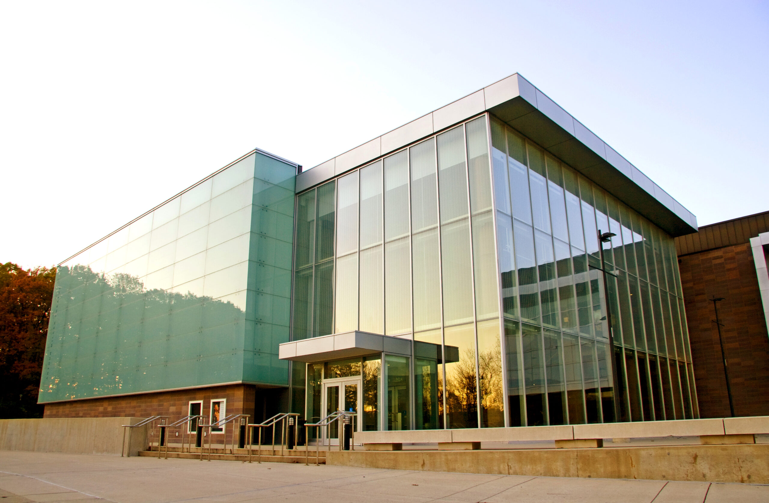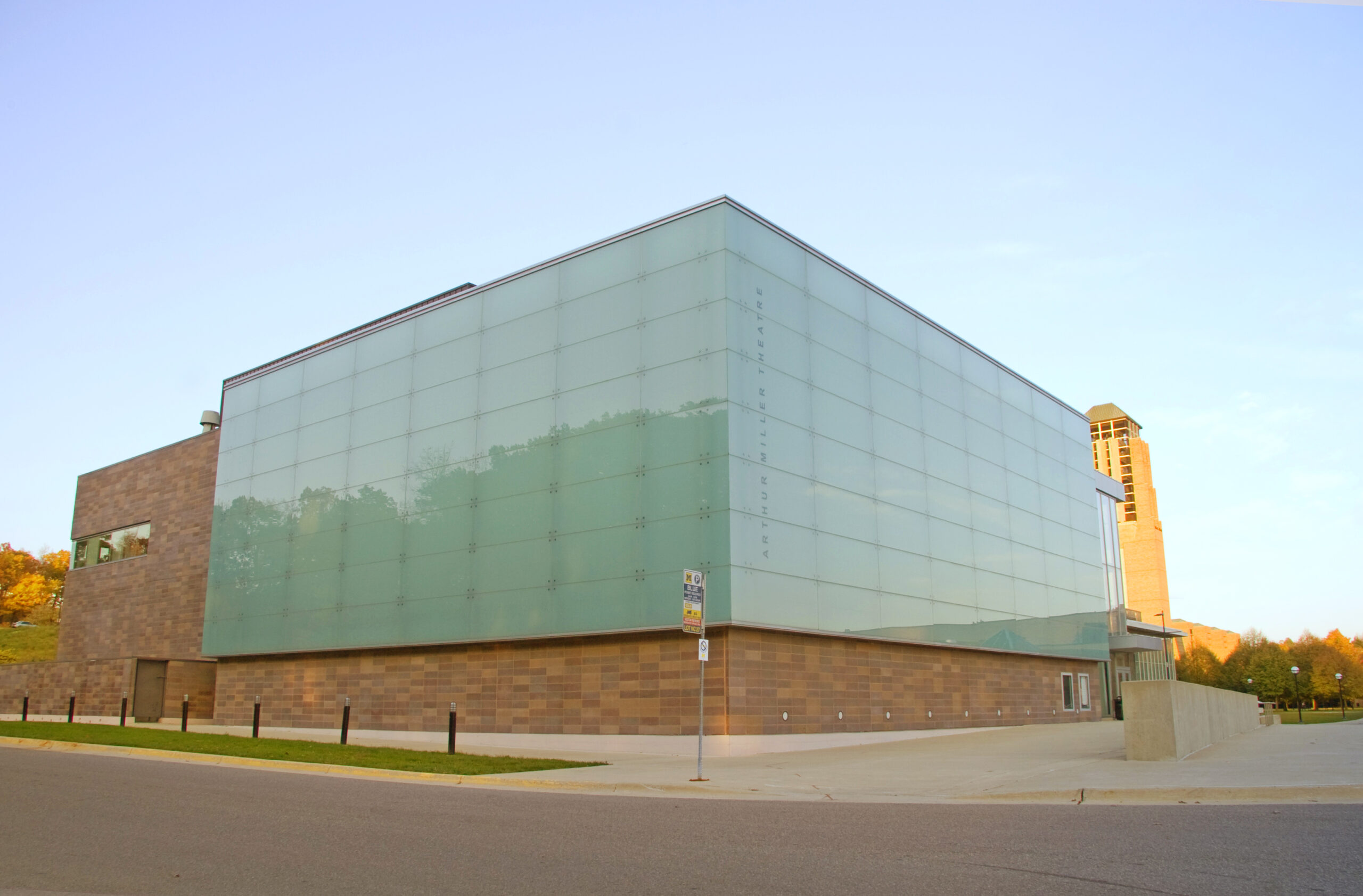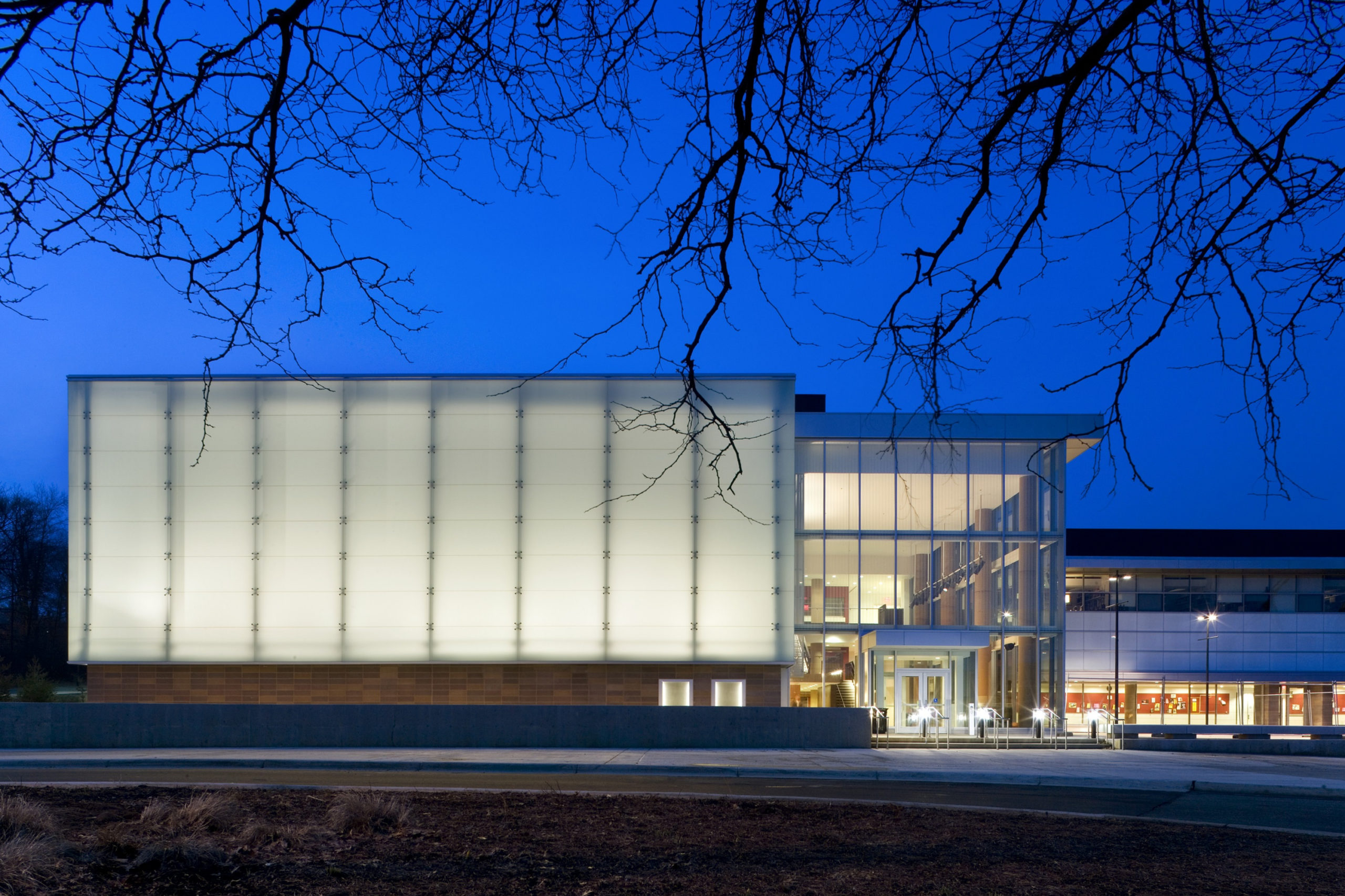 The Charles R. Walgreen Jr. Drama Center and Arthur Miller Theater consists of the 250-seat black box Arthur Miller Theatre, and the ‘learning loft’ that includes academic and administrative spaces. The theatre is wrapped in a translucent glass envelope, which makes an elegant and bold statement during the day and evening when it is illuminated. The learning loft contains three flexible 150-seat performance/teaching studios, a full scene shop, and production space on ground level. A glass hallway connects the studios and provides a window where theatre students can be seen practicing.